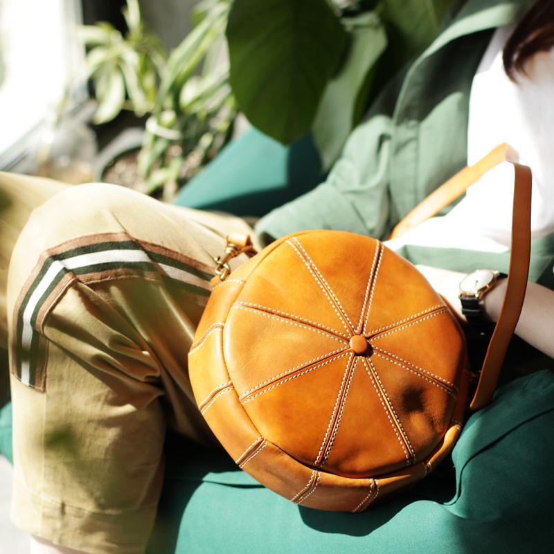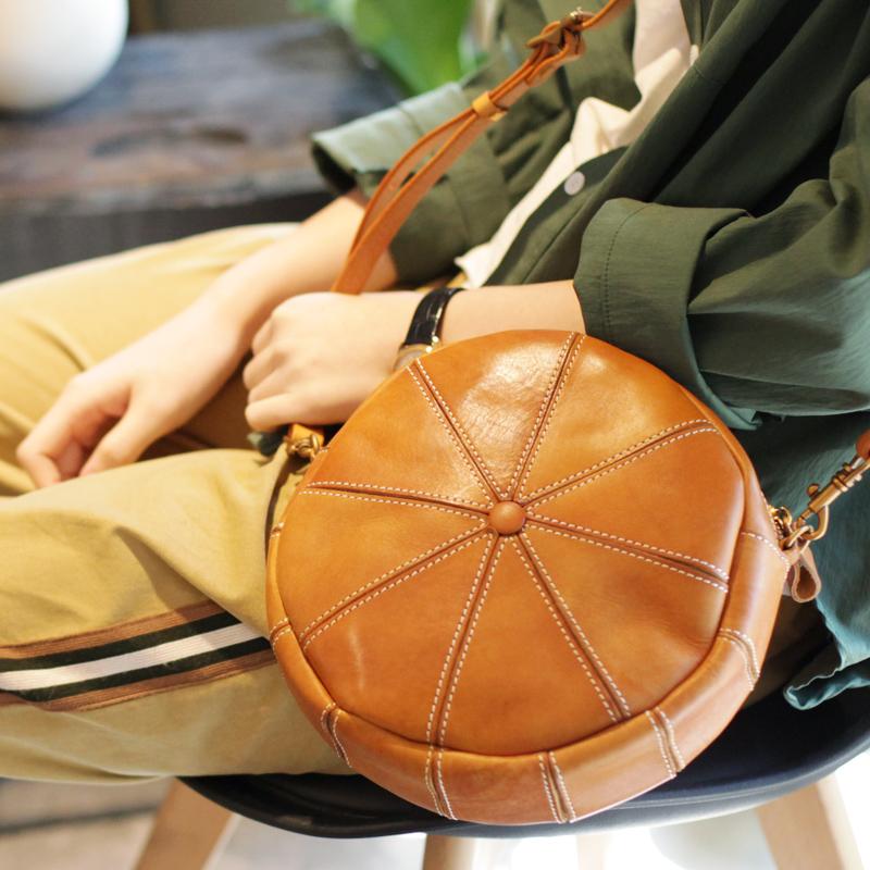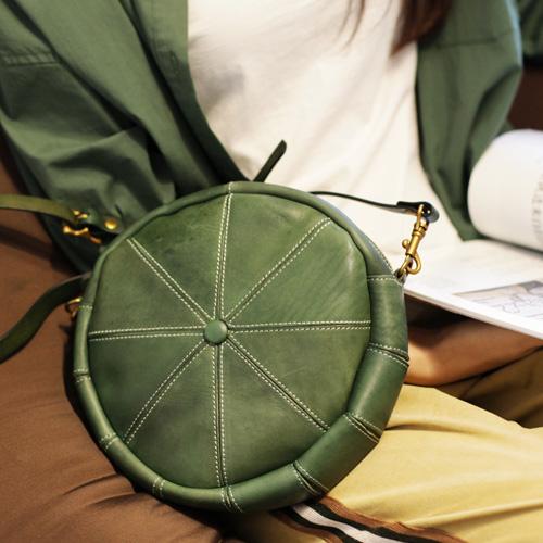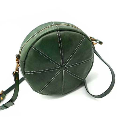 Design: Handmdade Leather Circle Round Stitched Bags Purses Shoulder Crossbody Bags Purses In Stock: 3-5 Days To Process Orders Include: A Handbag Custom: None Color: Brown, Green Material: Italian Cowhide Measures: inch 8" (20cm × 5cm × 20cm) Weight: 0.58kg Slots: 1 main slot, 1 inner slot, 1 inner slotMore