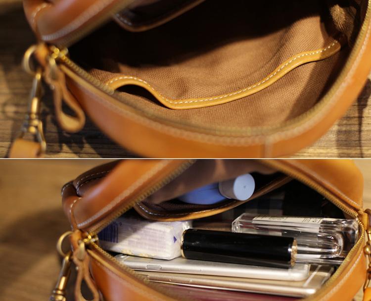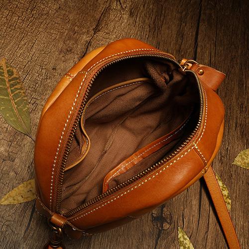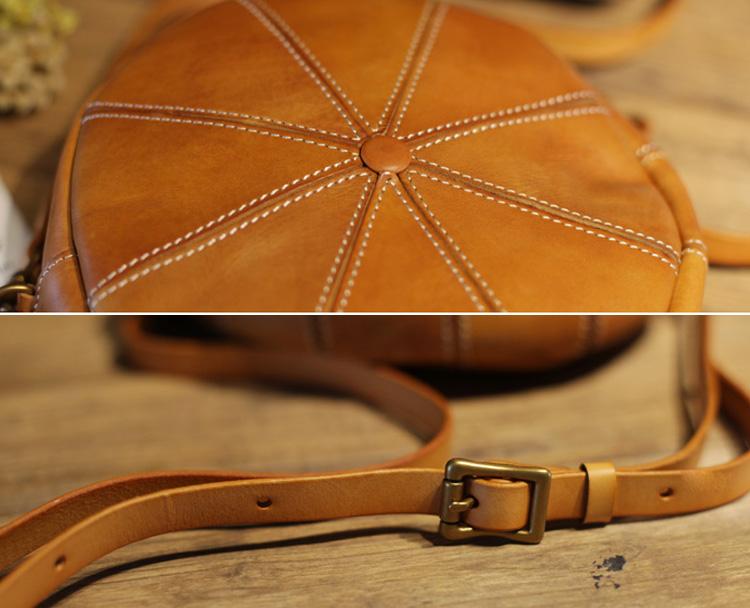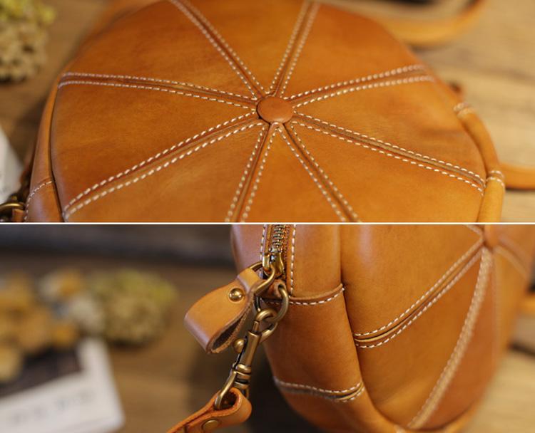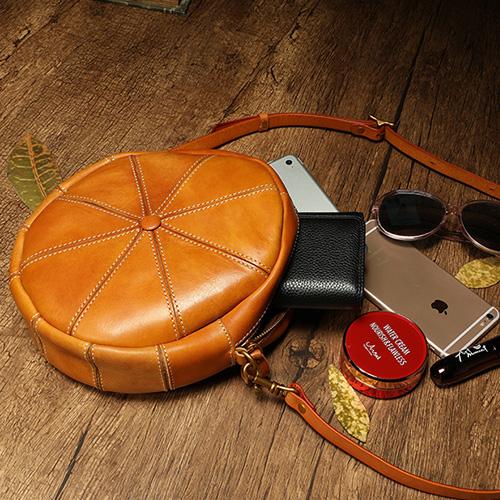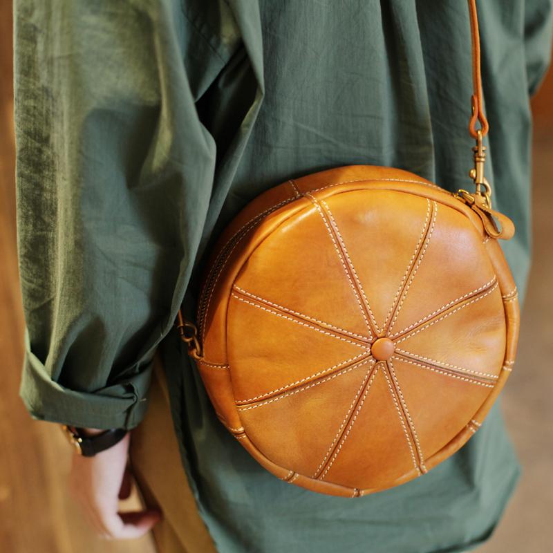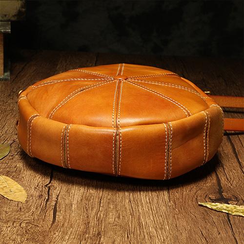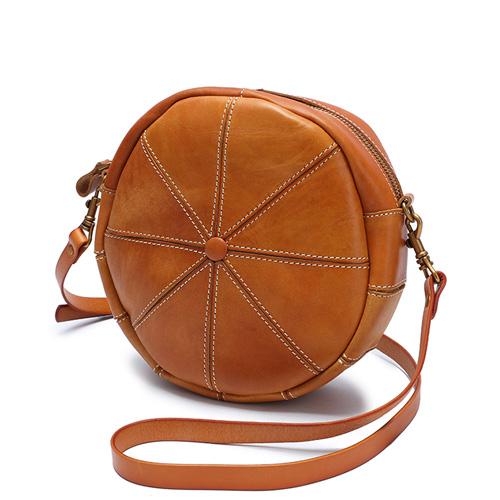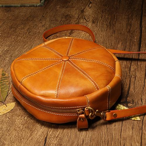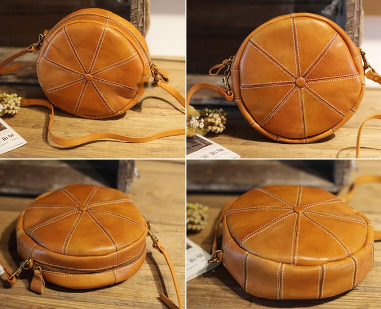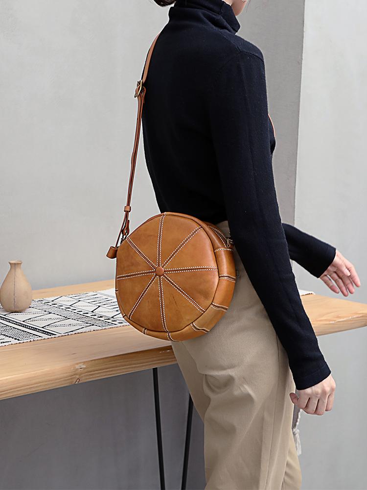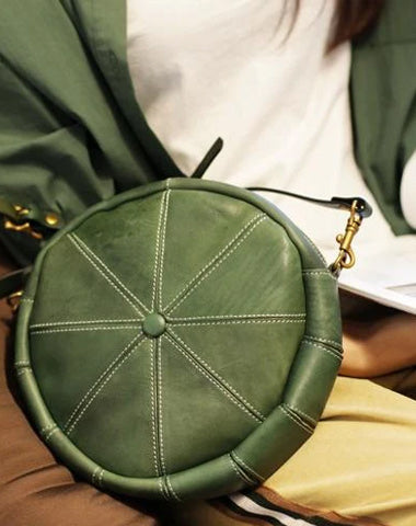 Design: Handmdade Leather Circle Round Stitched Bags Purses Shoulder Crossbody Bags Purses In Stock: 3-5 Days To Process Orders Include: A Handbag Custom: None Color: Brown, Green Material: Italian Cowhide Measures: inch 8" (20cm × 5cm × 20cm) Weight: 0.58kg Slots: 1 main slot, 1 inner slot, 1 inner slot Note: