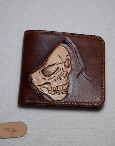 Style: Handmade Leather Skull Death Tooled Mens billfold Wallet Cool Leather Wallet Slim Wallet for Men