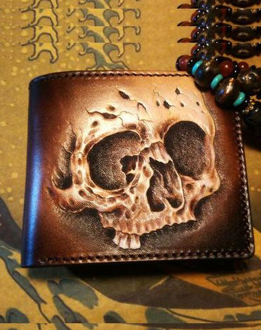 Design: Handmade Leather Skull Tooled Mens billfold Wallet Cool Leather Wallet Slim Wallet for Men