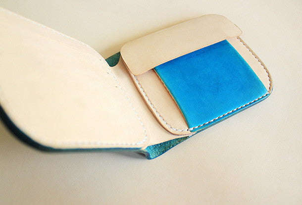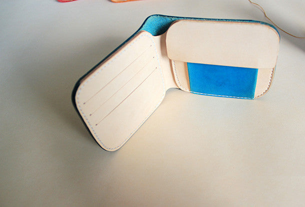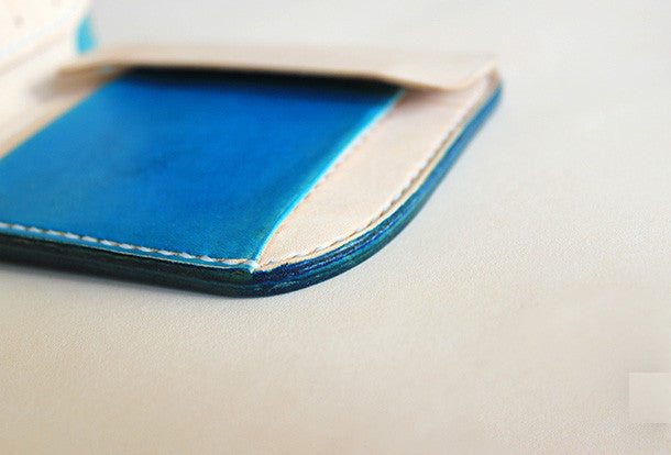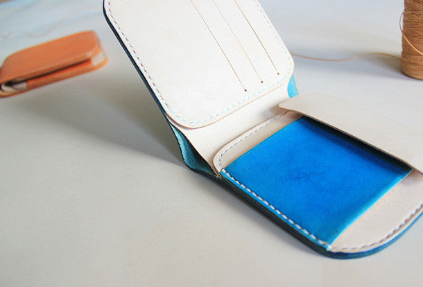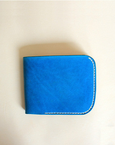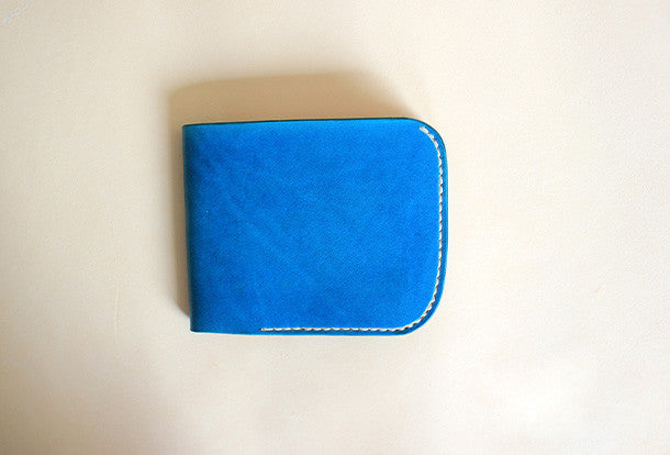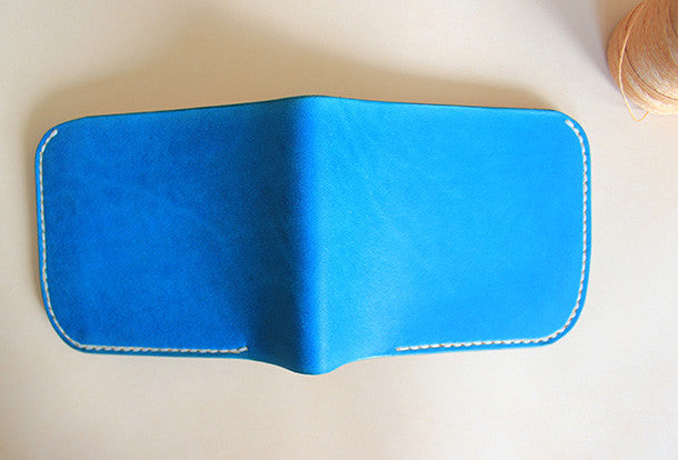 This is Handmade blue pretty cute fashion hand dyed leather billfold ID card holder bifold wallet for women/lady girl gift for her.The wallet is biifold,color is blue,There are ?1 full size bill slots,4 ID slots and 1 coin pouch~Hand-made in the traditional method with punched holes and saddle stitching by hand.