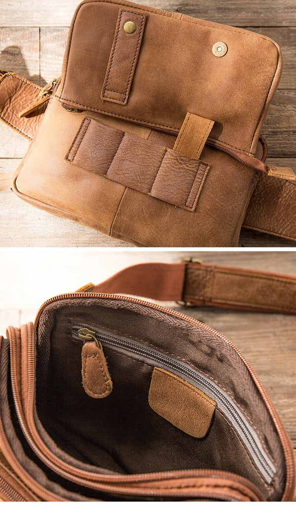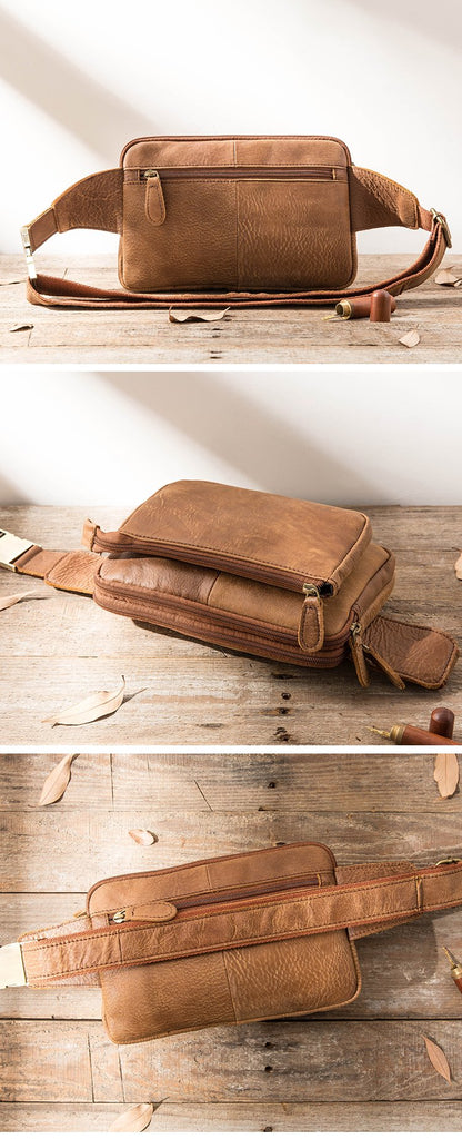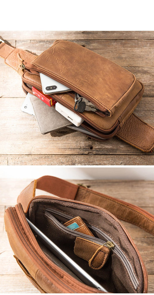 Design: Brown Handmade Leather Mens 8inches Waist Bag Chest Bag Multifunction One Shoulder Backpack for Men