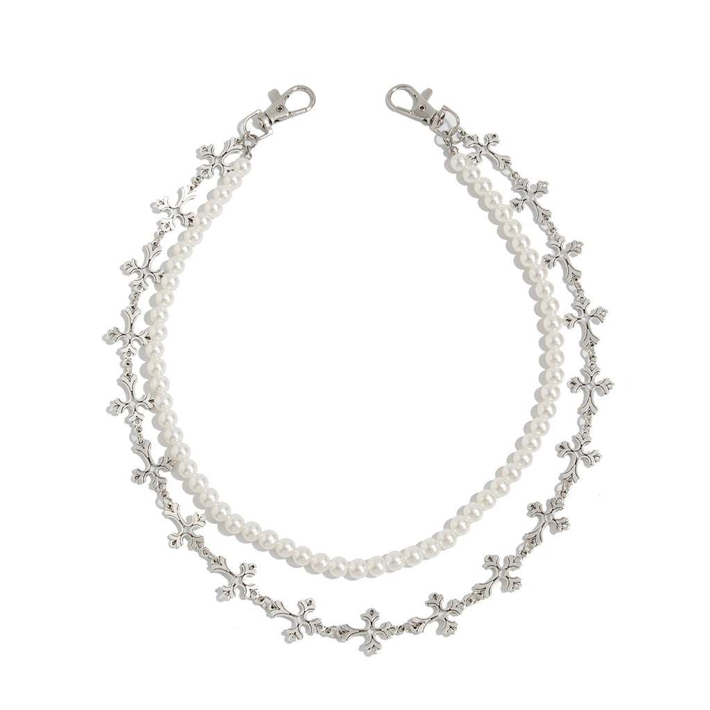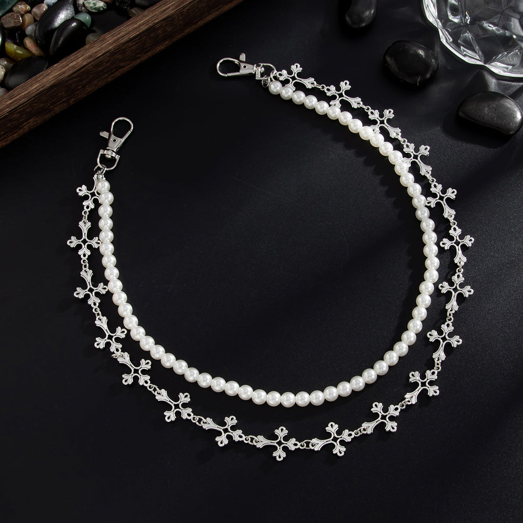 Discover the perfect fusion of edgy symbolism and feminine elegance with our exquisite Pearl Wallet Chain, a beautifully layered accessory designed for the modern woman. This unique Double Wallet Chain features a striking 60cm outer strand of interconnected cross pendants, artfully linked to create a continuous spiritual motif, paired with a delicate 55cm inner chain of lustrous faux pearls. This distinctive Cross Wallet Chain harmoniously blends sacred symbolism with soft sophistication, offering a versatile piece that transitions effortlessly from Y2K street style to casual chic.