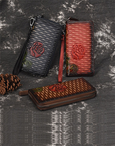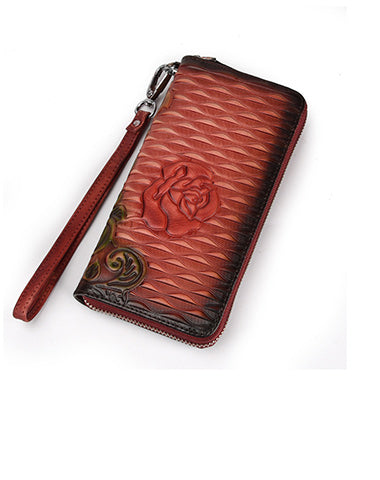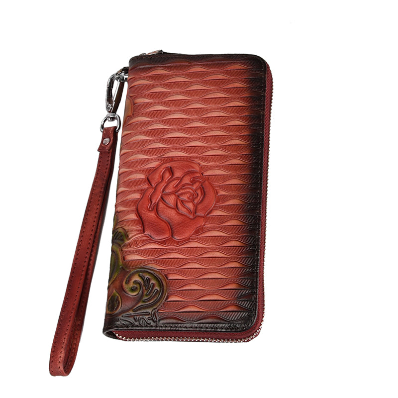 Design: Womens Rose Flower Red Leather Zip Around Wallet Wristlet Wallet Flower Ladies Zipper Clutch Wallet for Women