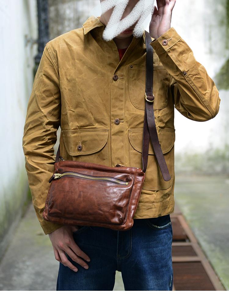 Design: Black Handmade Wrinkled Leather Men Large Shoulder Bag Brown Messenger Bag Crossbody Bag For Men