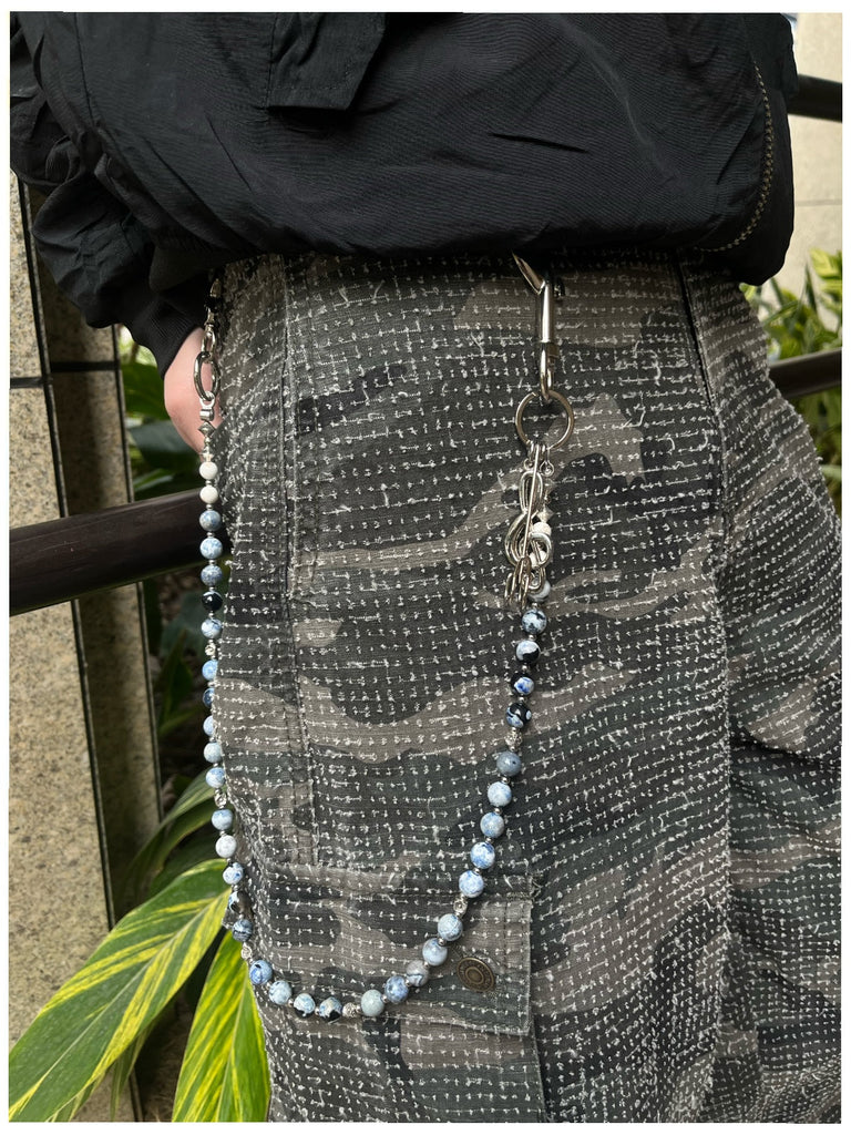 Discover a truly unique accessory with our stunning beaded Wallet Chain, where artistic inspiration meets urban functionality. This 78cm masterpiece features exquisite blue stone beads with natural watercolor-like veining, elegantly paired with delicate plum blossom beads that create a captivating visual rhythm. The chain is finished with a distinctive music note charm and a bold safety pin accessory near the clasp, making this beaded pants chain a perfect blend of artistic expression and alternative edge.