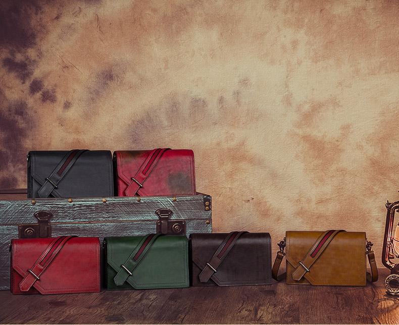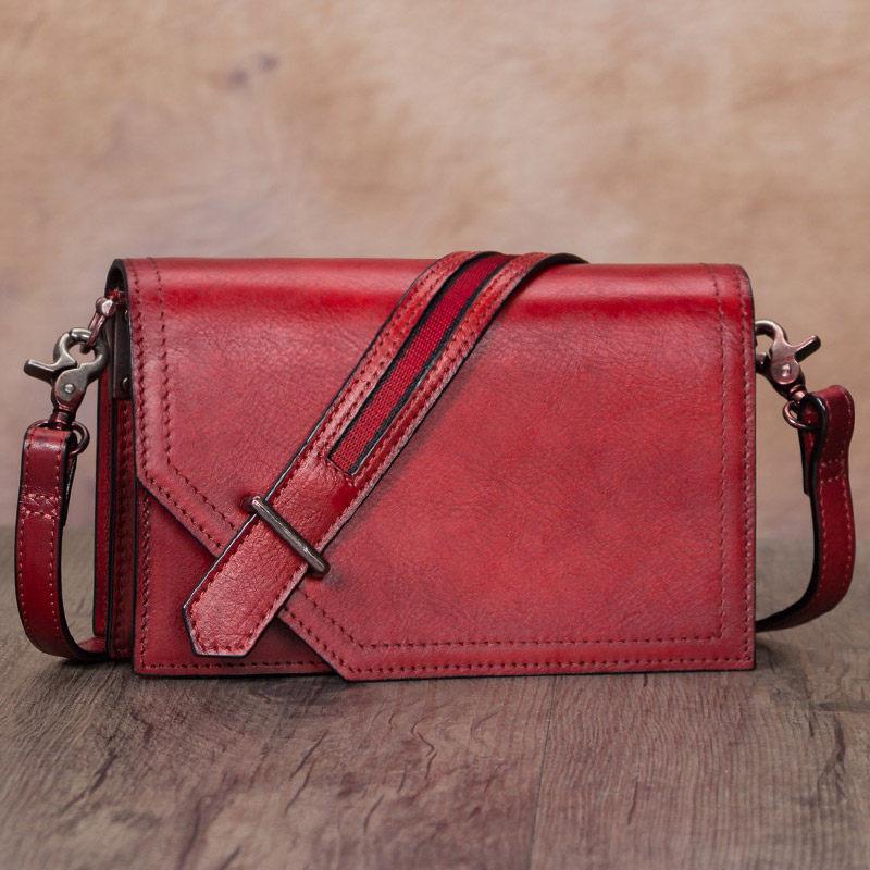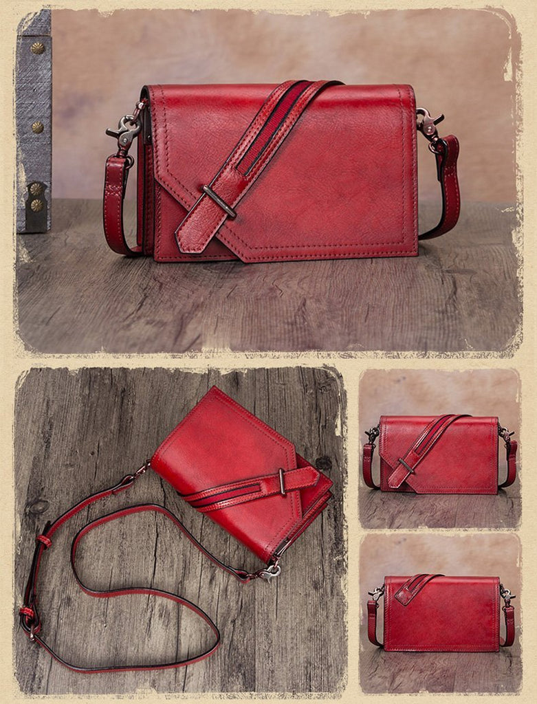 Leather Vintage Red Womens Side Bag Square Flap Over Satchel Shoulder Bag Crossbody Bag Purse for Ladies