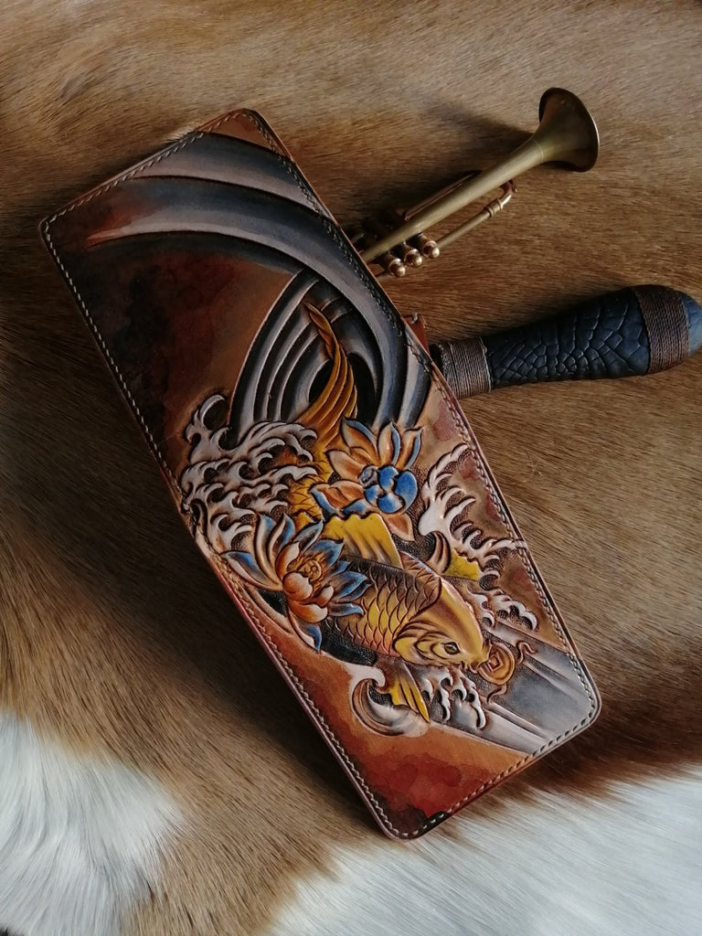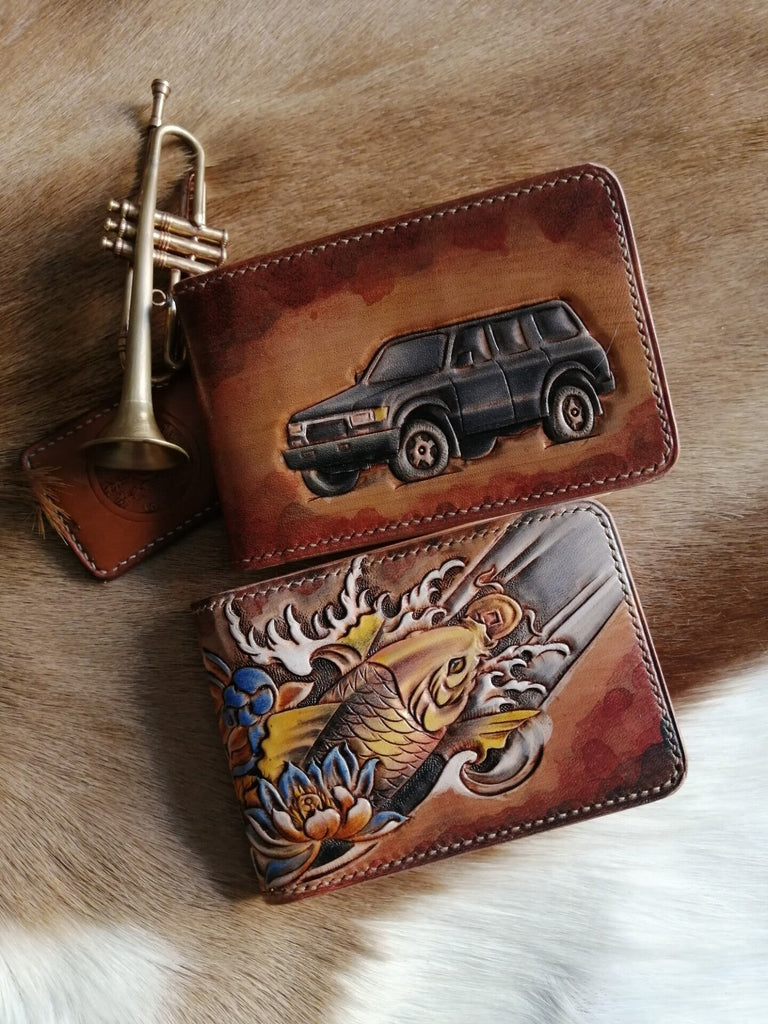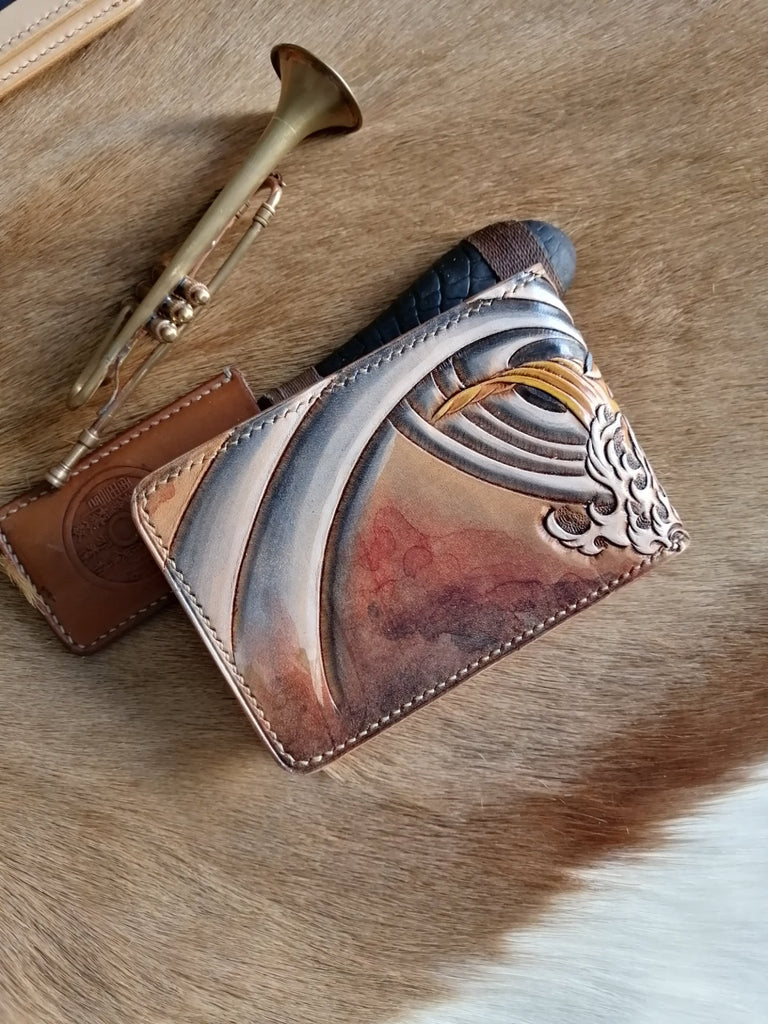 Design: ID Holder Wallet Mens Wallet with ID Window Wolf Tooled Leather Wallet Card Wallet with ID Window