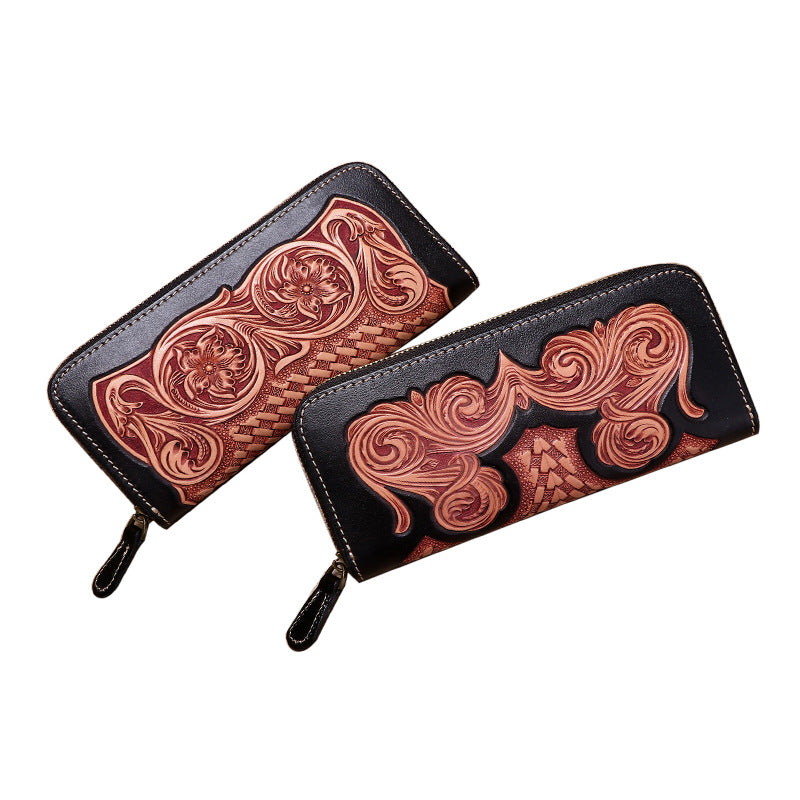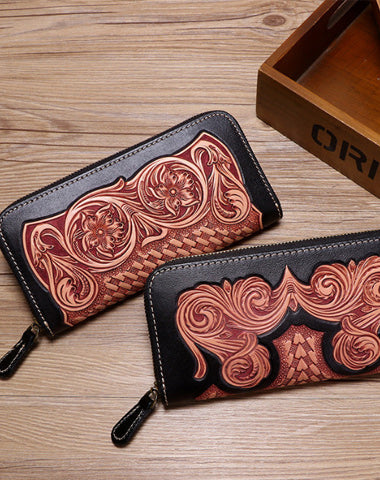 Style: Cool Leather Floral Tooled Zipper Around Wallet Handmade Clutch Zipper Wallet for Men