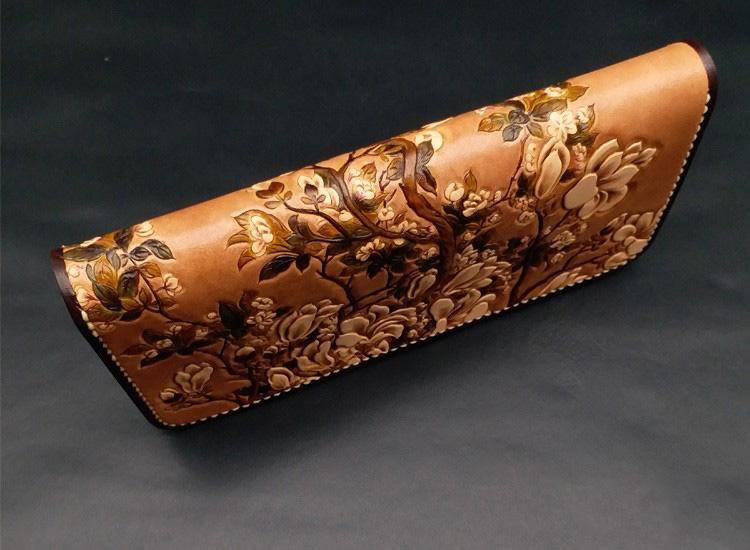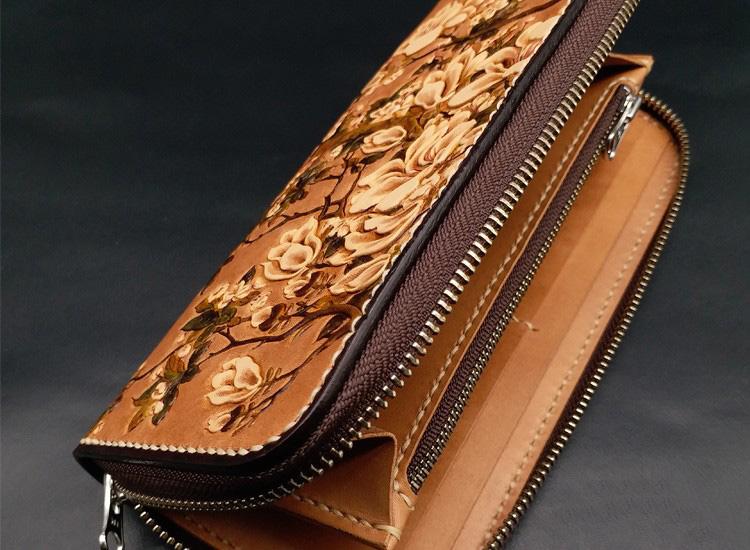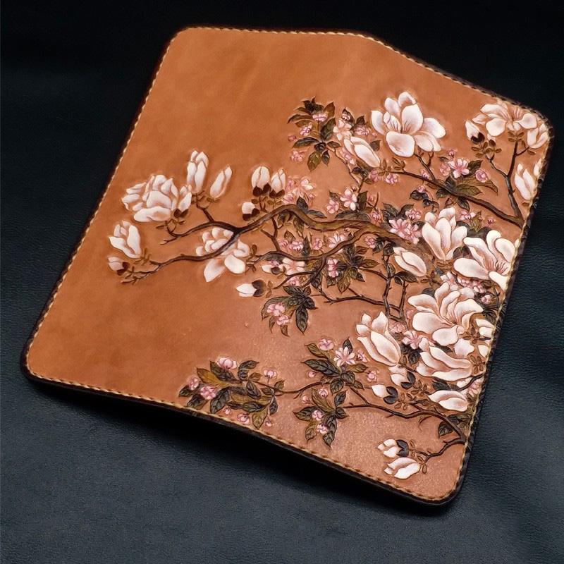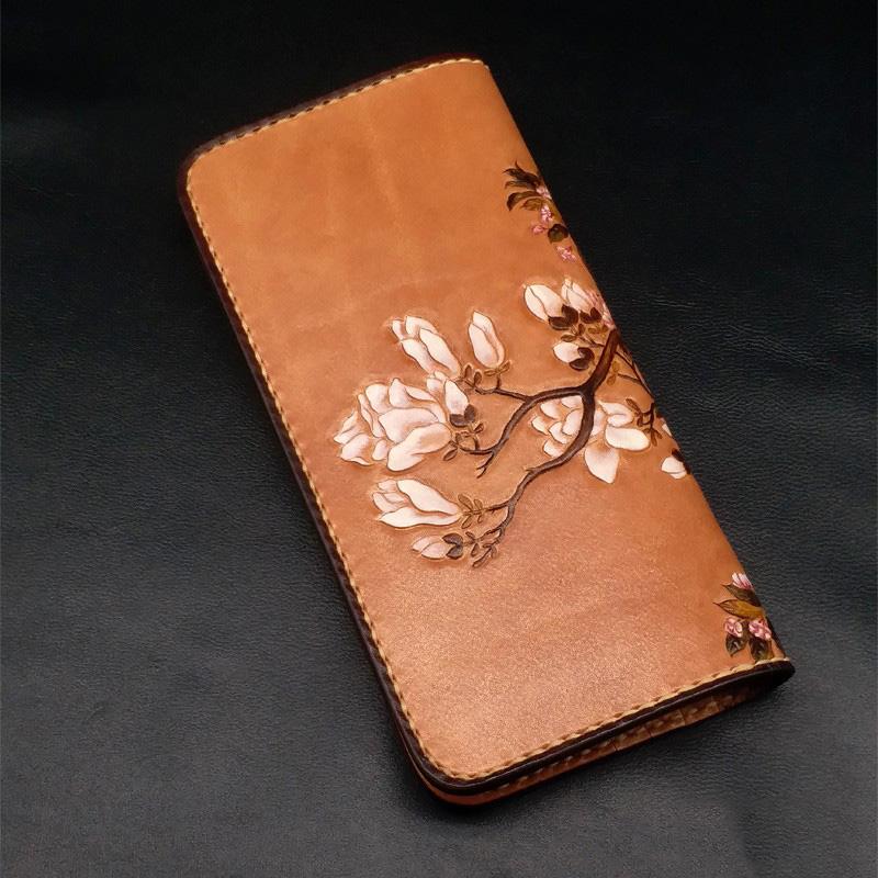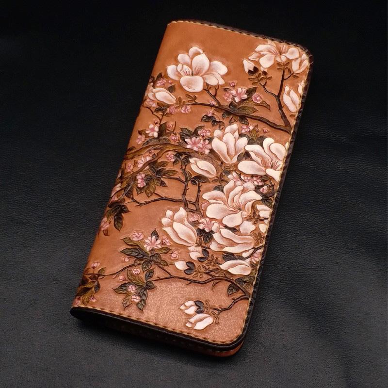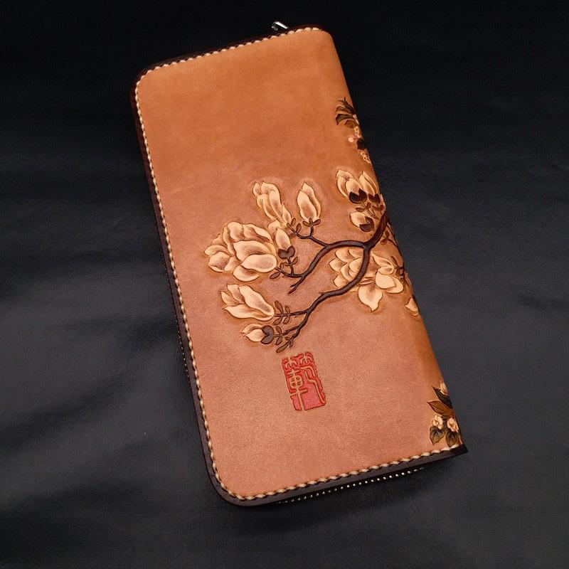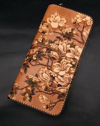 Style: Handmade White Flowers Magnolia denudata Tooled Leather Womens Long Wallet Zipper Clutch For Women