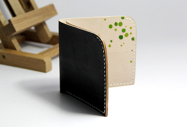 This is Handmade custom personalized ?black green beige vintage hand painted dyed leather billfold bifold wallet for women/lady girl gift for her.The wallet is bifold,color is beige,green,black,There are ?1 full size bill slots,2 ID slots~Hand-made in the traditional method with punched holes and saddle stitching by hand.