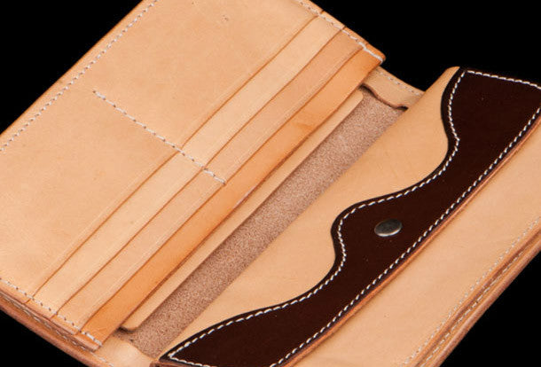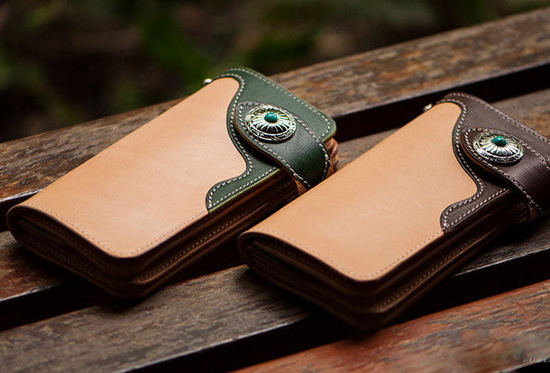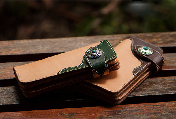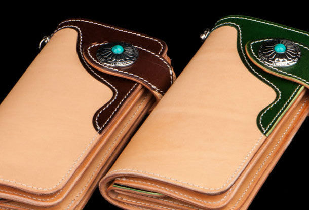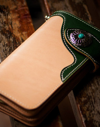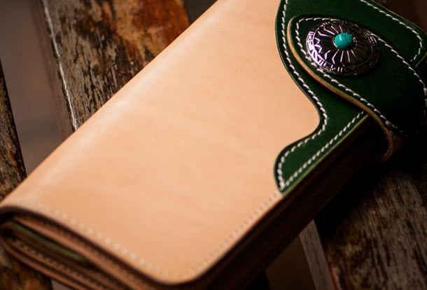 This is handmade beige green natural Italian men ?Vegetable Tanned leather?long biker wallet purse clutch for men.The wallet is bifold,color is beige&green.There are 2?full size bill slots/holders, 6?ID/credit card slots/holders~Hand-made in the traditional method with punched holes and saddle stitching by hand.