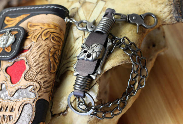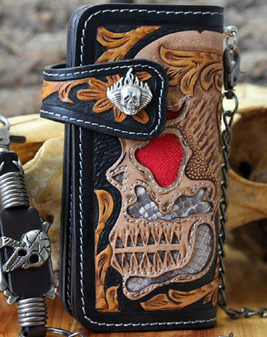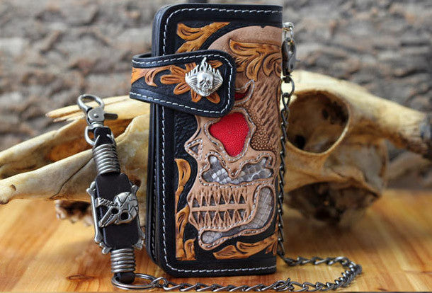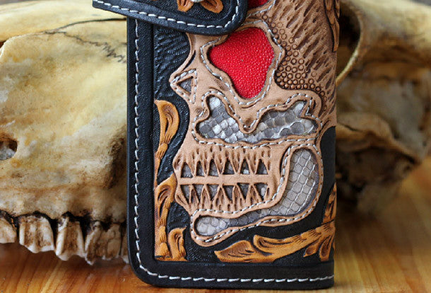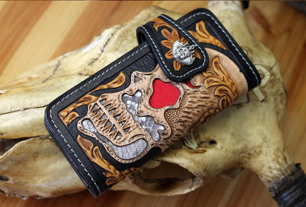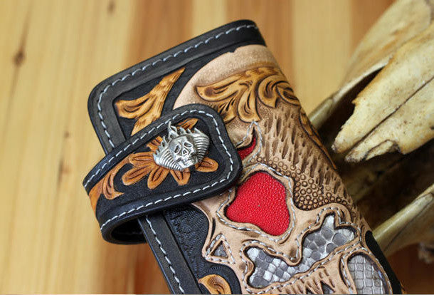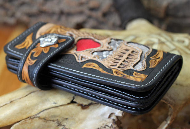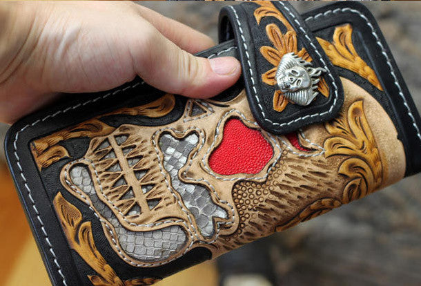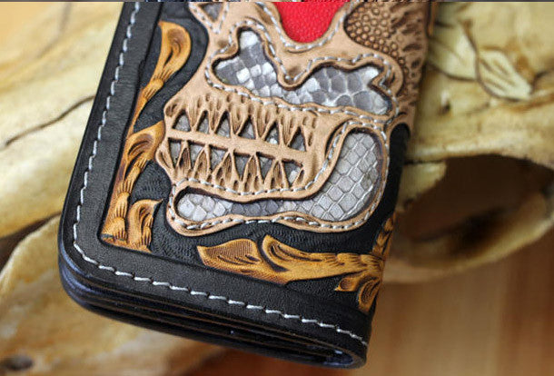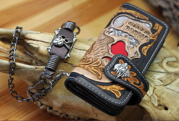 This is handmade natural leather?long skull punk?carved biker wallet purse clutch for men.The wallet is bifold,color is black.There are 3?full size bill slots/holders, 10?ID/credit card slots/holders, 1 zip coin slot/holder~Hand-made in the traditional method with punched holes and saddle stitching by hand.