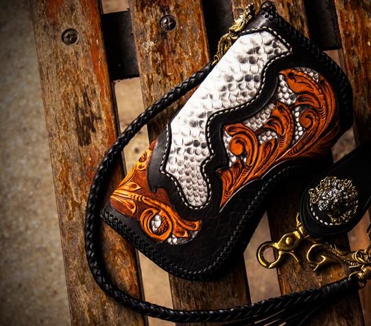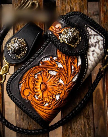 Style: Handmade Leather Tooled Floral Mens Chain Biker Wallet Cool Leather Wallet With Chain Wallets for Men