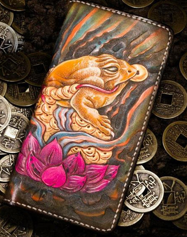Design: Handmade Leather Tooled Golden Toad Mens Chain Biker Wallet Cool Leather Wallet Long Phone Wallets for Men