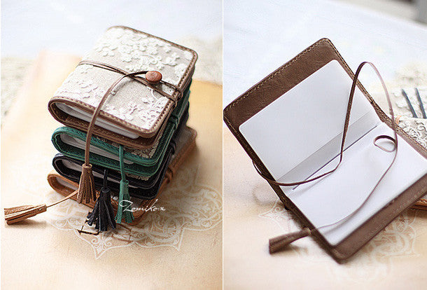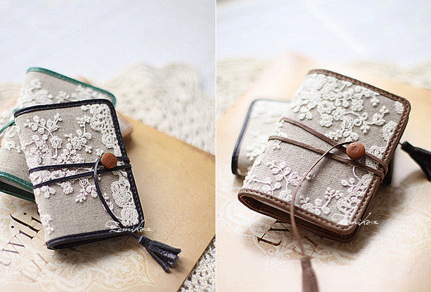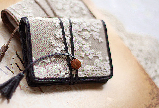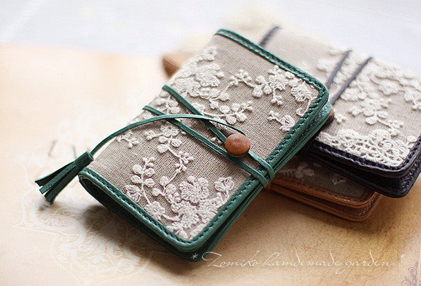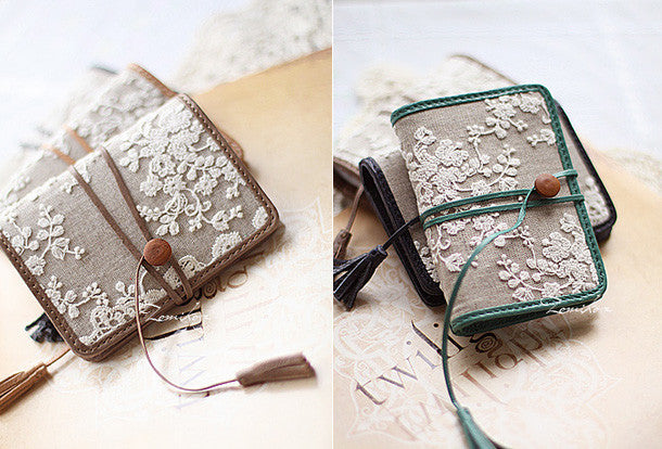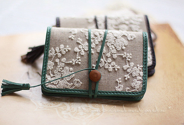 This is Handmade vintage rustic retro sweet cute pretty beautiful fabric lace leather small cards wallet pouch purse for women/lady girl.There are 20 card ID holders.color is green,light brown,dark blue,beige~Hand-made in the traditional method with punched holes and saddle stitching by hand.