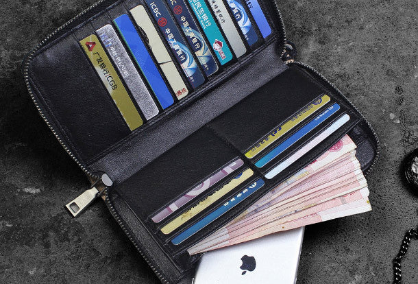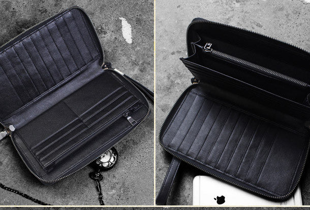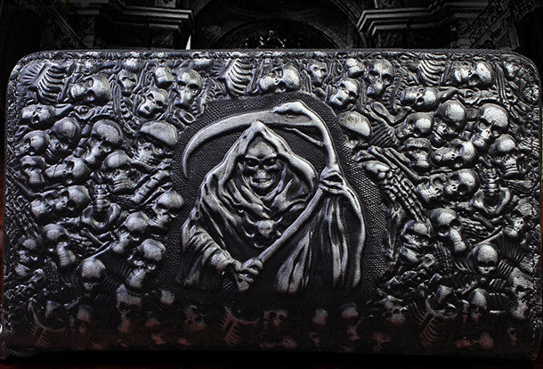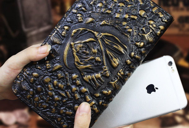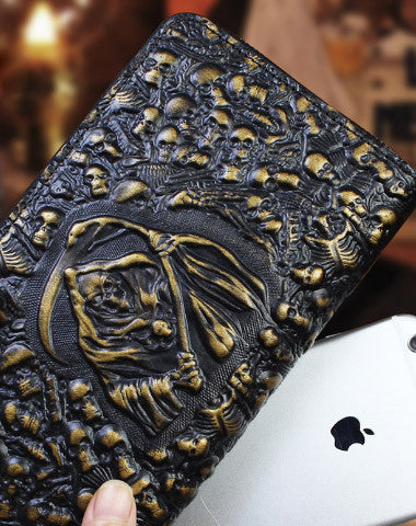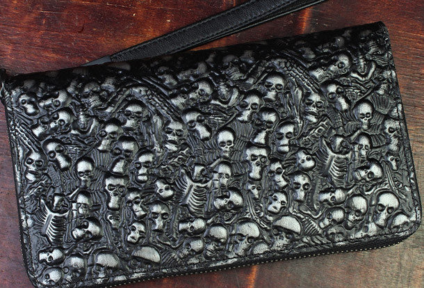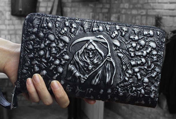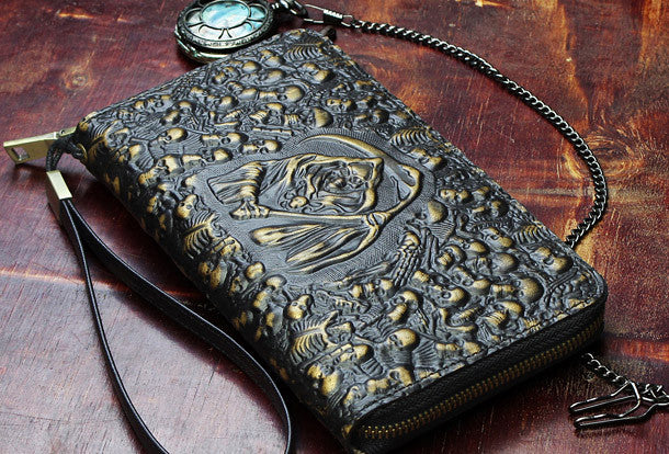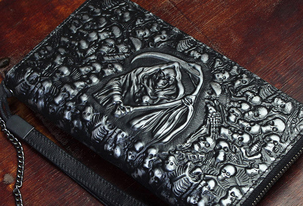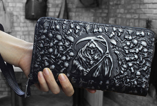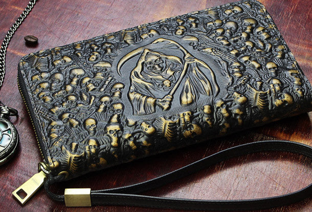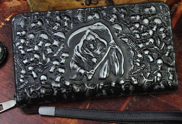 Handmade zip long wallet leather men skull death clutch phone wallet for men