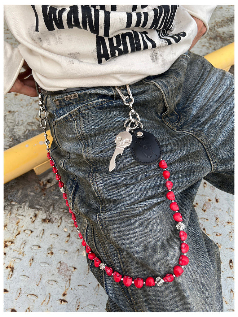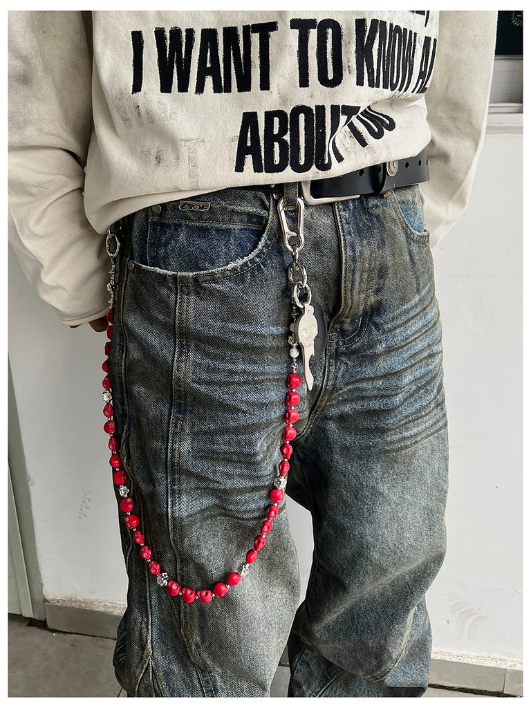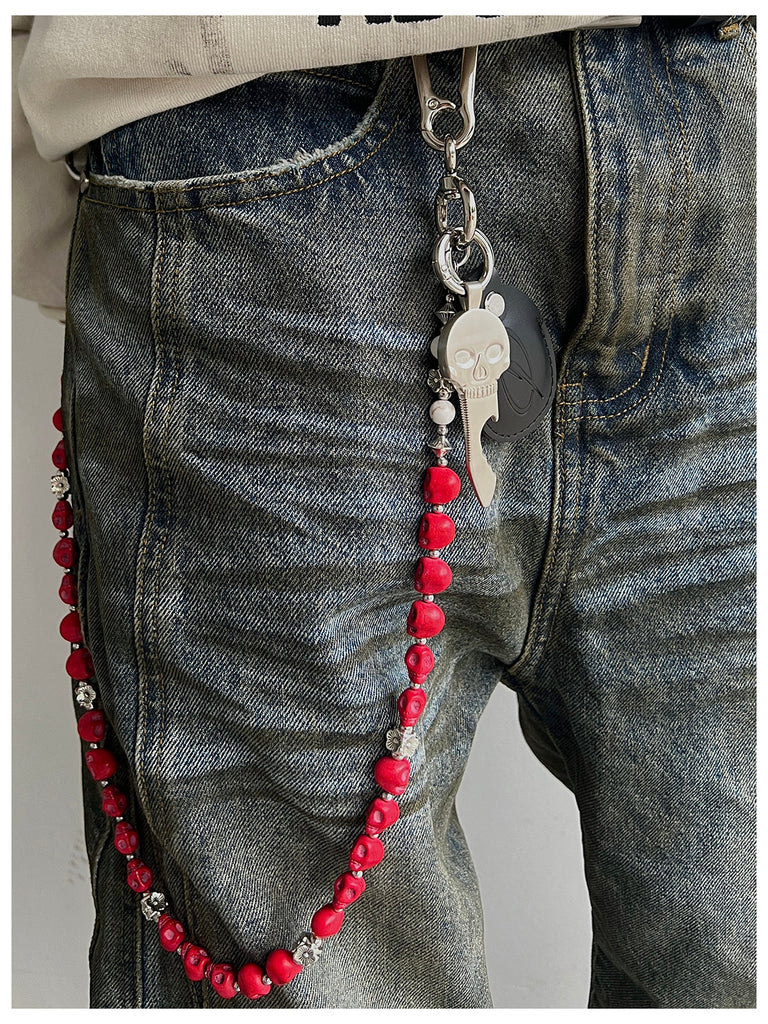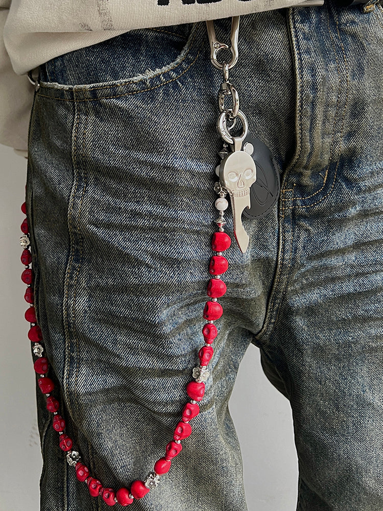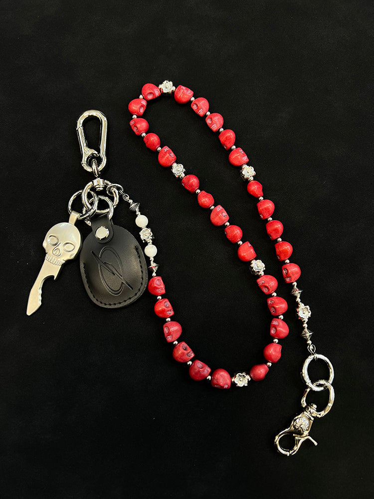 Unleash your bold side with our extraordinary Skull Head Wallet Chain, a statement piece that redefines alternative fashion. This 78cm chain features a striking design composed of meticulously carved red stone skull heads, artfully interspersed with alloy plum blossom beads. The pièce de résistance? A functional skull-shaped bottle opener attached to one end, making this Skull Wallet Chains collection both edgy and practical for social occasions.
