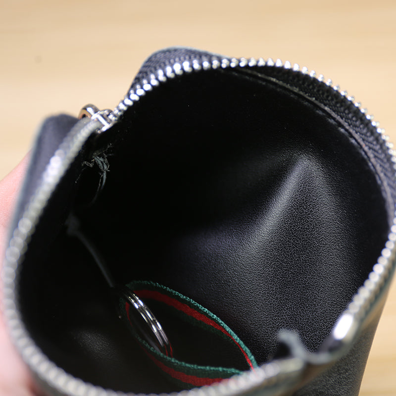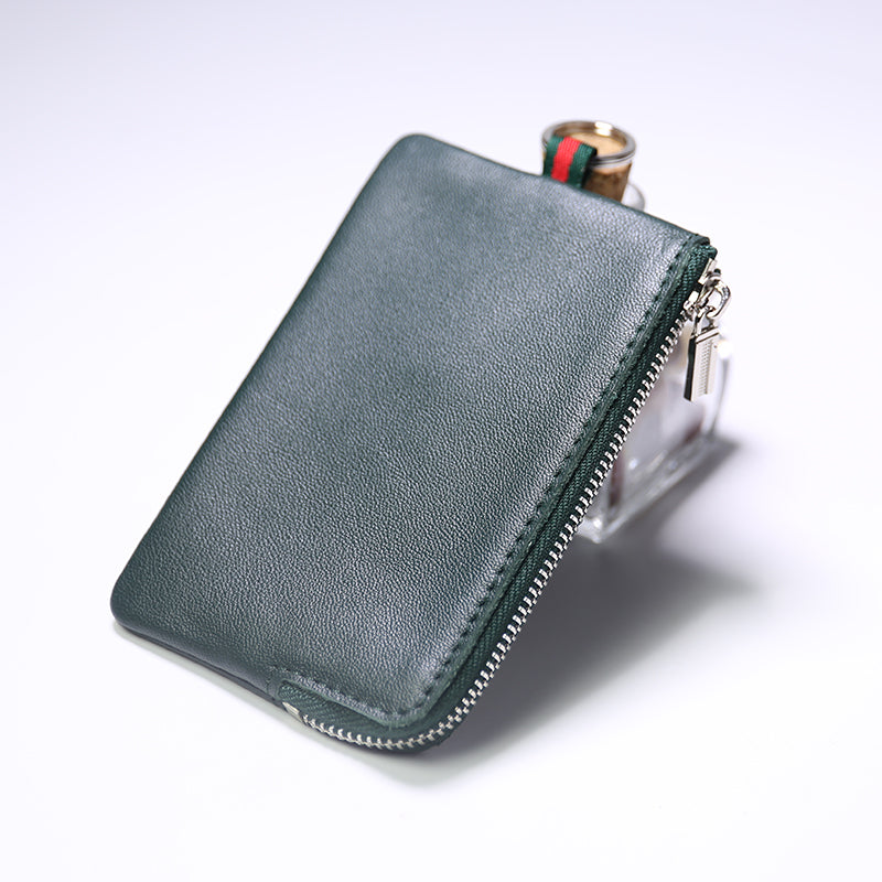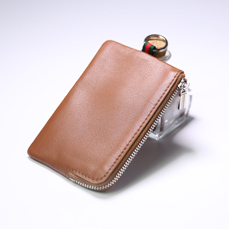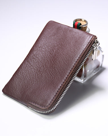 Design: Slim Women Coffee Leather Zip Wallet with Keychains Billfold Minimalist Coin Wallet Small Zip Change Wallet For Women