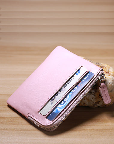 Slim Women Pink Leather Card Wallet Minimalist Zip Billfold Card Holder Wallet Coin Wallet For Women