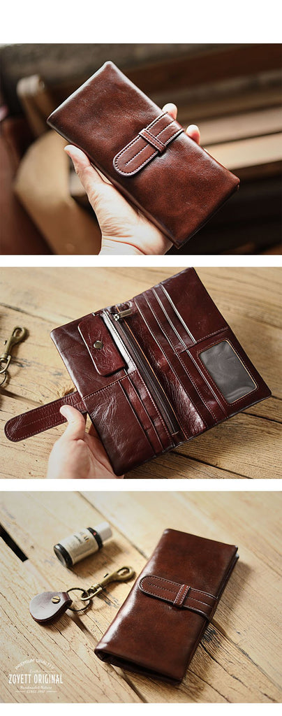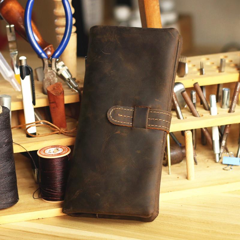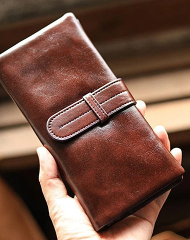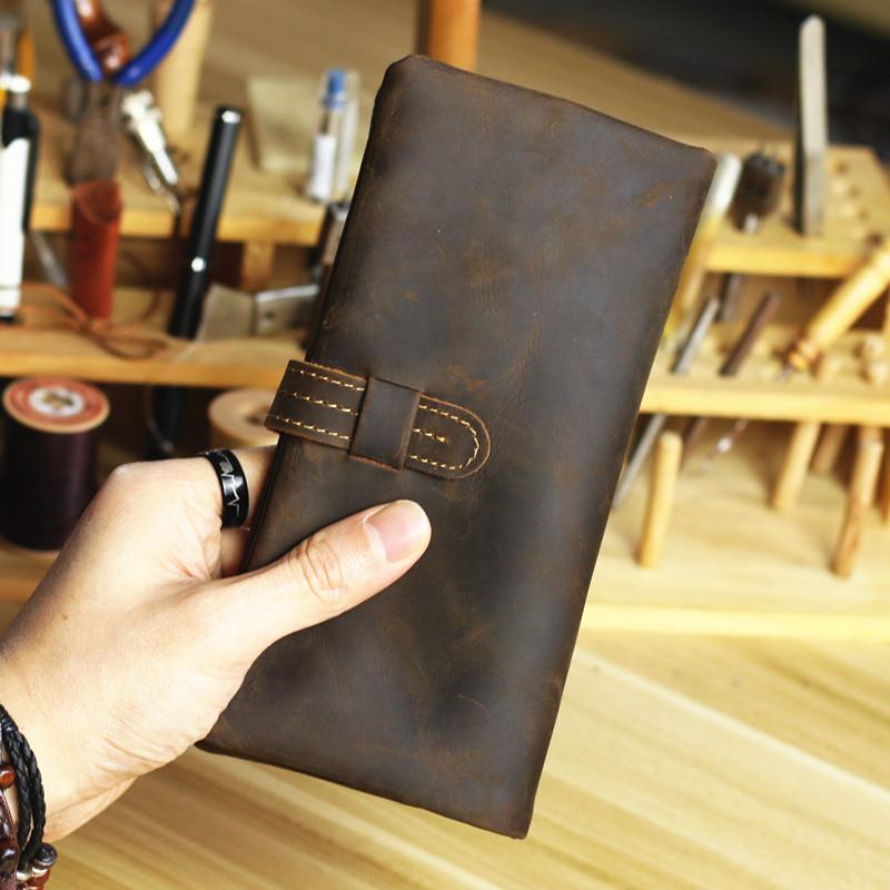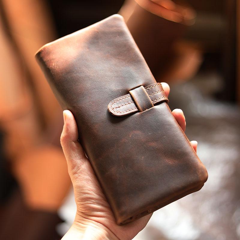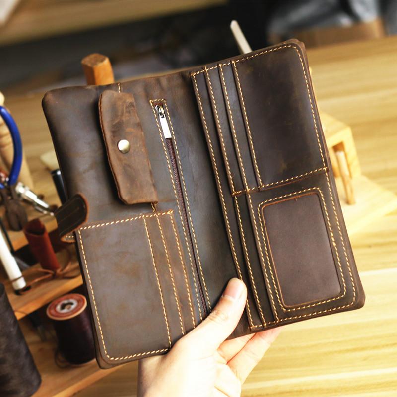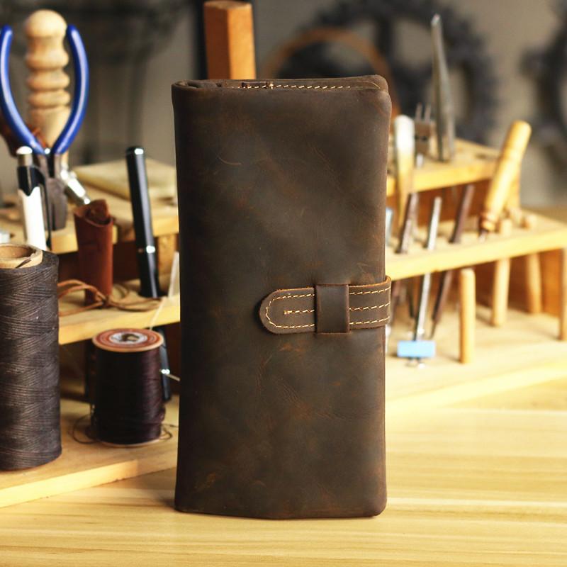 Design: Vintage Dark Brown Leather Mens Phone Wallet Brown Clutch Bag Bifold Zipper Long Wallet For Men