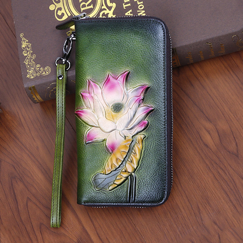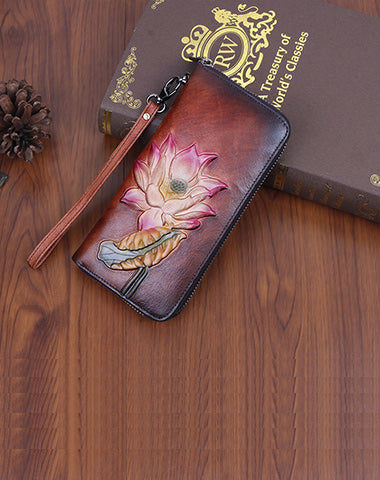 Design: Womens Lotus Flower Coffee Leather Wristlet Wallets Zip Around Wallet Flower Ladies Zipper Clutch Wallet for Women