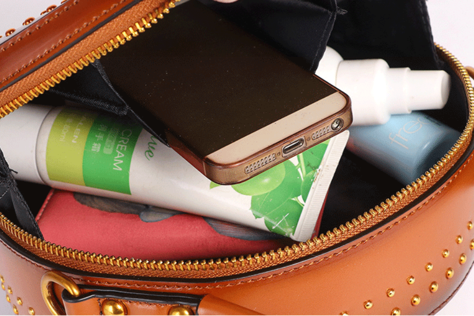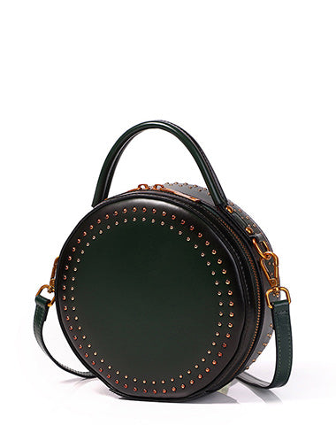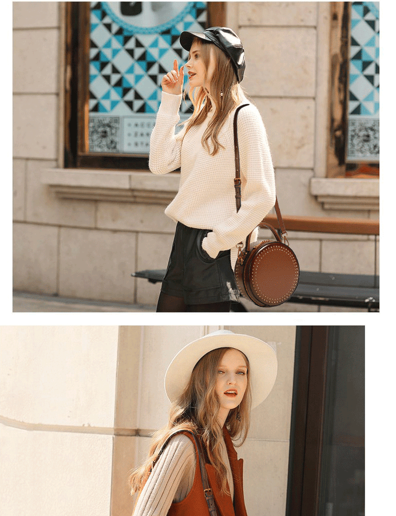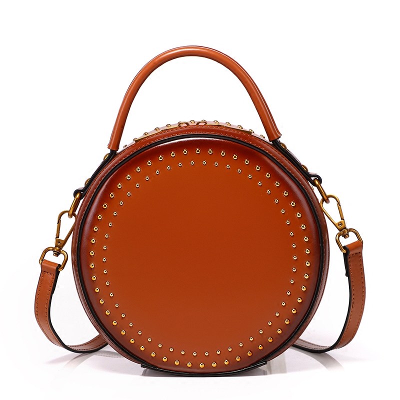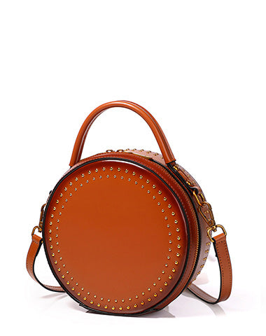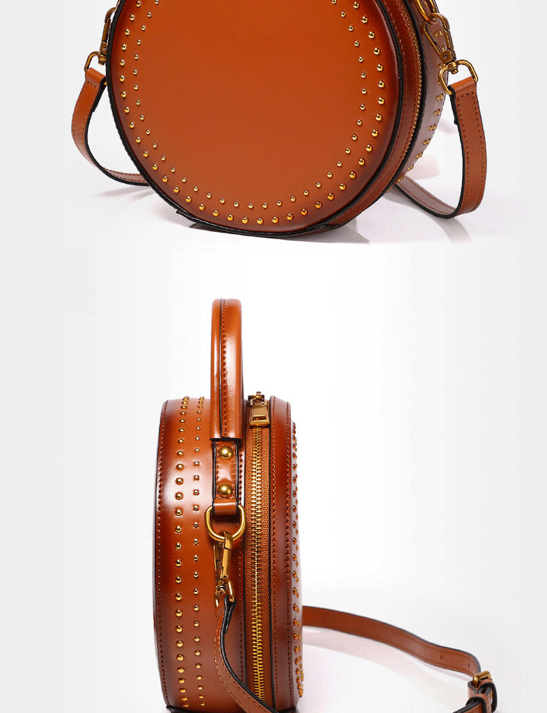 Design: Womens Red Leather Round Handbag with Rivet Crossbody Purse Red Round Shoulder Bag for Women